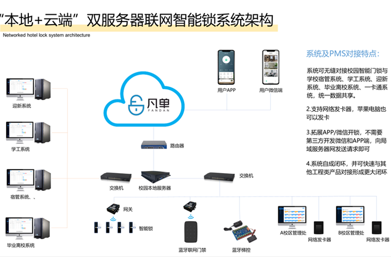 拉盯智能校園門鎖解決方案采用本地服務(wù)器架構(gòu)設(shè)計(jì),通過智能硬件(智能鎖,智能水電設(shè)備,網(wǎng)關(guān),NB-iot物聯(lián),4G,藍(lán)牙等聯(lián)網(wǎng)方式),物聯(lián)網(wǎng)平臺(tái),后臺(tái)管理軟件組成,系統(tǒng)支持:校園一卡通數(shù)據(jù)接入, 綜合提供房源管理、設(shè)備管理、房態(tài)管理、授權(quán)管理、員工管理、管理卡功能、記錄報(bào)表、異常入住告警及PMS對接等功能,對校園公寓、教室、實(shí)驗(yàn)室、辦公室等場景的安防及后勤管理開發(fā)的定制化解決方案。