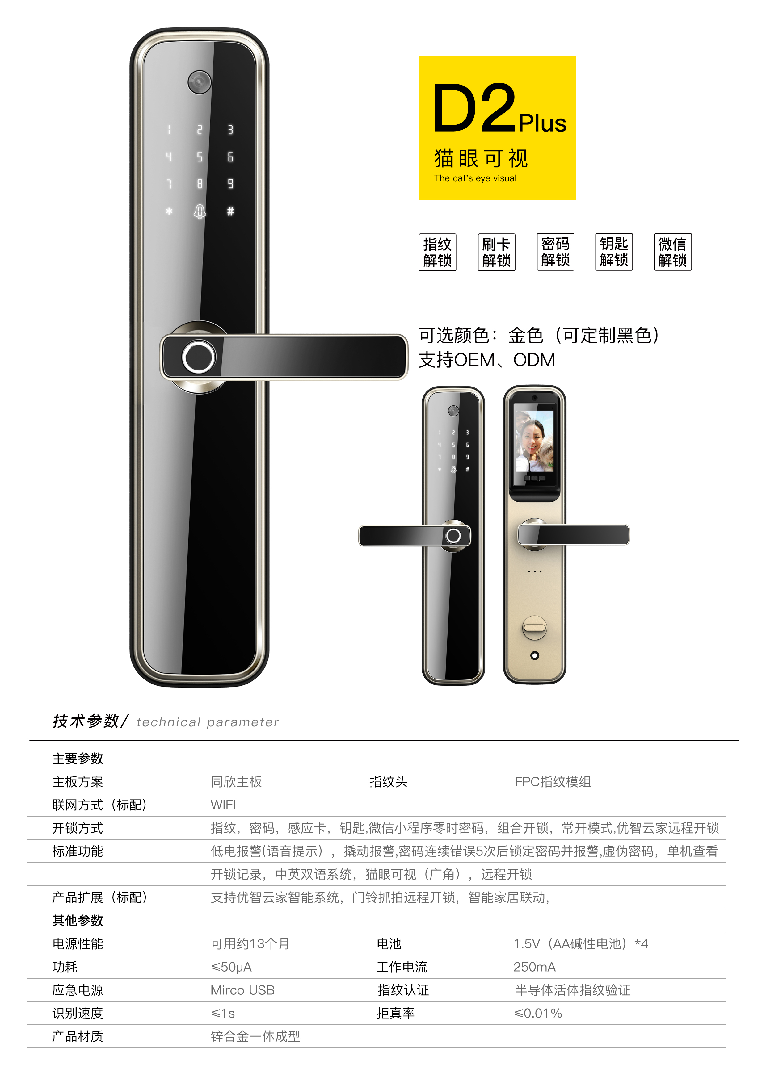 D2P是一款貓眼抓拍智能鎖當您在家門口按門鈴時即可抓拍發(fā)送一張圖到APP,APP收到提示查看認識即可遠程一鍵開鎖.......